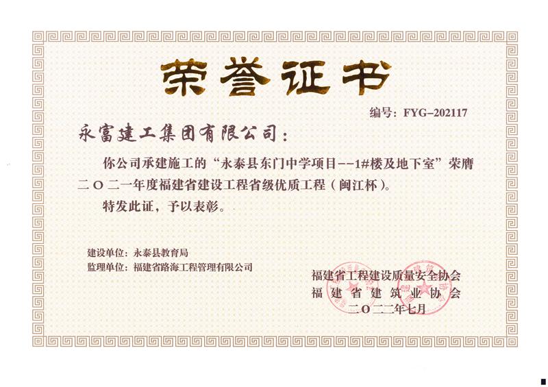 (2022.07)“永泰县东门中学项目-1#楼及地下室”荣膺二0二一年度福建省优质工程(闽江杯)